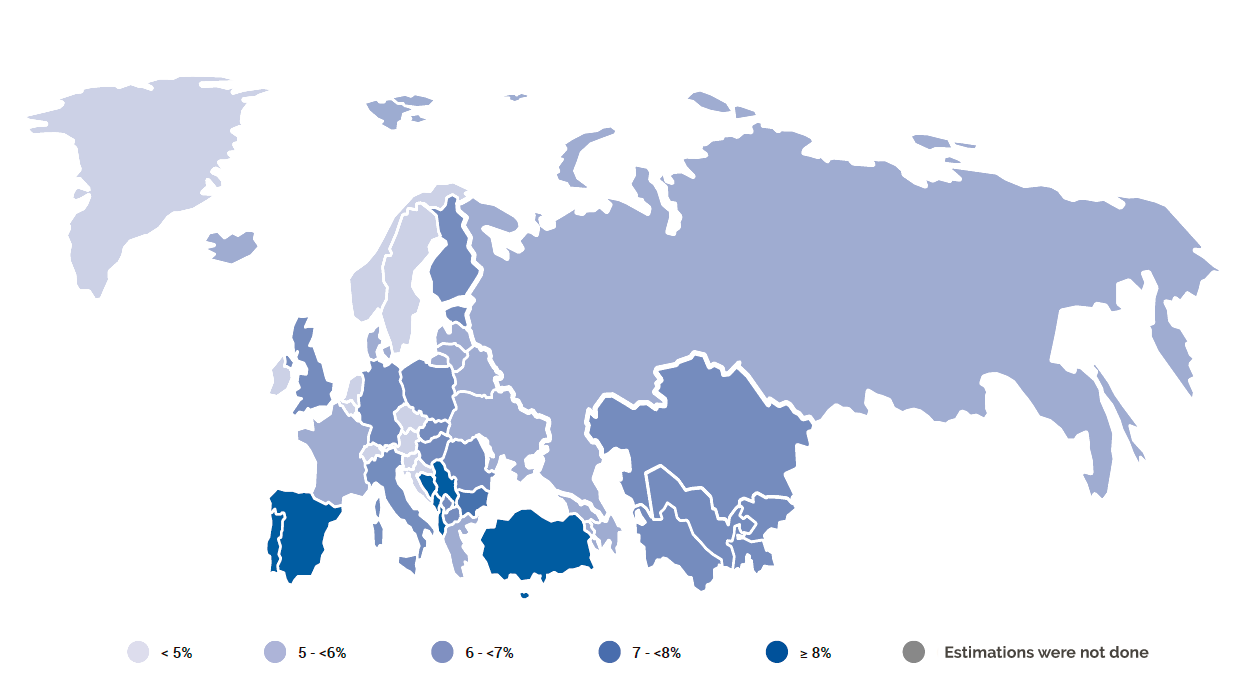 Comparative age-adjusted prevalence of diabetes (%) (20-79 years) in the IDF European Region in 2021