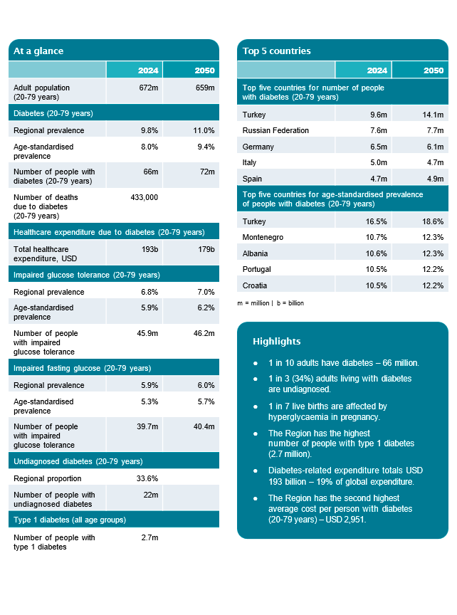 The IDF predicts that by 2045 prevalence of diabetes (9.2%) and the number of people with diabetes (61 million) in the European Region will increase by 13%. The European Region has the highest number of children and juveniles with type 1 diabetes (295 000). Moreover, there is the highest incidence every year – 31,000 new cases per year. The European Region ranks second in terms of the average cost of care per person with diabetes ($3,086). In 2021, US$189.3 billion was spent for combating diabetes, representing 19.6% of total spending worldwide.