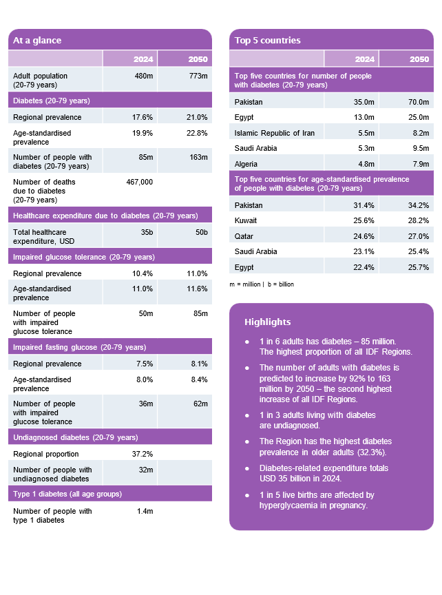 Estimates in the 10th edition of the IDF Diabetes Atlas are presented for 215 countries and territories grouped into seven IDF regions: Africa (AFR), Europe (EUR), Middle East and North Africa (MENA), North America and the Caribbean (NAC), South and Central America (SACA), Southeast Asia (SEA), and Western Pacific (WP). A total of 219 data sources from 144 countries were included in the analysis.
